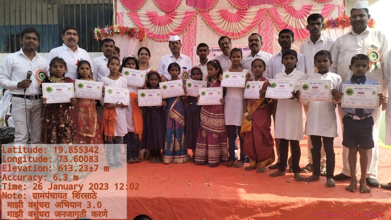 आकाश या घटकांतर्गत ई प्रतिज्ञा घेणे, ई प्रतिज्ञाची पूर्तता करणे, विविध स्पर्धांच्या माध्यमातून माझी वसुंधरा अभियान लोकांपर्यंत पोहोचवण्यासाठी जिल्हा परिषद शाळा शिरसाटे येथे निबंध स्पर्धा, चित्रकला स्पर्धा, रांगोळी स्पर्धा, गायन स्पर्धा व टाकाऊ पासून टिकाऊ वस्तू निर्मिती बाबतच्या स्पर्धा घेण्यात आल्या. कार्यक्रमाचे प्रमुख पाहुणे जिल्हा नियोजन समिती गोरख बोडके, गटविकास अधिकारी डॉ. लता गायकवाड, विस्ताराधिकारी संजय पवार, ज्ञानेश्वर कऱ्हाळे, स्वदेश फाउंडेशनचे श्री. बामणे यांच्या हस्ते बक्षीस वितरण करण्यात आले. माझी वसुंधरा या अभियान अंतर्गत प्रत्येक विद्यार्थ्याला प्रमाणपत्र व एक झाड देण्यात येऊन वृक्ष लागवडीचा संदेश या सांस्कृतिक कार्यक्रमाचे माध्यमातून देण्यात आला. कार्यक्रमासाठी सरपंच गोकुळ सदगीर, उपसरपंच शितल विलास चंदगीर, ग्रामसेवक हनुमान दराडे, ग्रामपंचायत सदस्य श्यामसुंदर सोपनर, तारा गणेश तेलंग, अलका दोंदे, रमेश शीत, गांगुर्डे, ग्रामपंचायत कर्मचारी भावराव गांगुर्डे, संपत सप्रे, भास्कर सदगीर, दिनकर म्हसणे, सीआरपी सुनीता ढोन्नर आदींनी विशेष सहकार्य केले. मुख्याध्यापक हरिश्चंद्र जाधव, शिक्षक गणेश पवार, मधुकर धनगर,कुणाल चव्हाण, स्वाती लोहार, सप्रेवाडीचे मुख्याध्यापक रामदास शिंदे, लोहरे सर यांनी सांस्कृतिक कार्यक्रम यशस्वी करण्यासाठी विशेष मेहनत घेतली. सूत्रसंचालन मधुकर धनगर यांनी, ग्रामसेवक हनुमान दराडे यांनी आभार मानले.