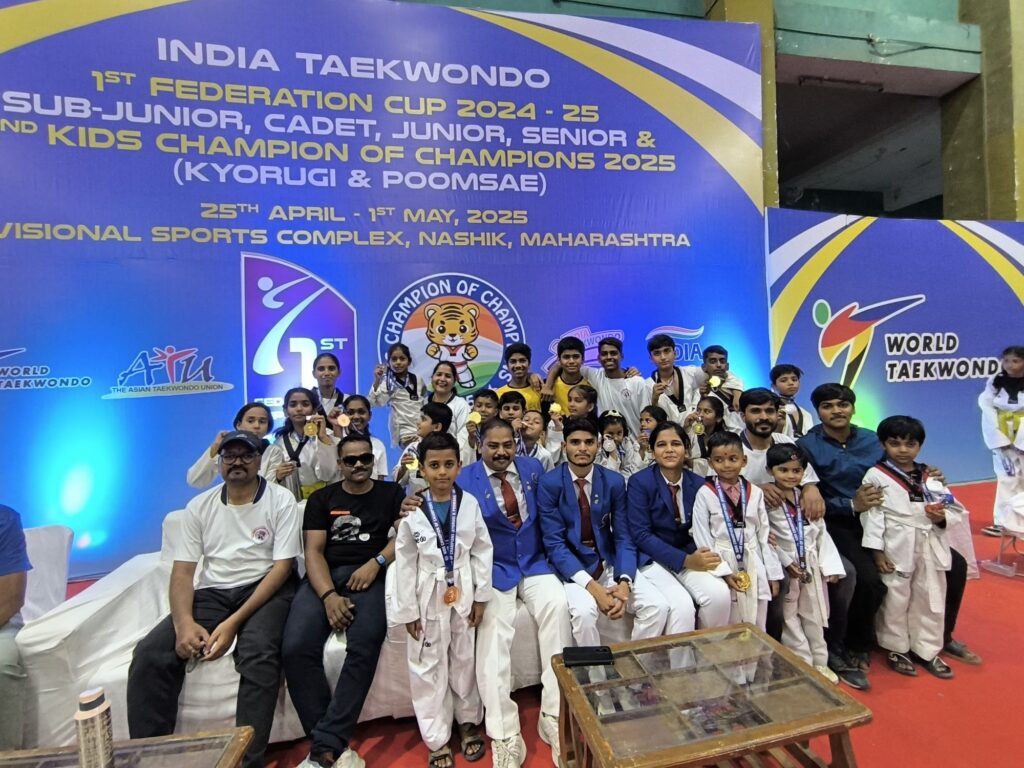 इगतपुरीनामा न्यूज – नाशिक येथे २९ आणि ३० एप्रिलला आयोजित करण्यात आलेल्या इंडियन तायक्वांदो यांच्यातर्फे भारतातील दुसरी किड्स चॅम्पियन ऑफ चॅम्पियन स्पर्धा संपन्न झाली. यामध्ये इगतपुरीतील आयडियल तायक्वांदो अकॅडमीच्या खेळाडूंनी महाराष्ट्राचे प्रतिनिधित्व केले. या स्पर्धेत आयडियल तायक्वांदो अकॅडमीच्या खेळाडूंनी ११ सुवर्णपदक, ४ रौप्य पदक आणि ३ कांस्य पदक अशी १८ पदकांची कमाई करून घवघवीत यश मिळवले. या स्पर्धेमध्ये ८ वर्ष आतील २४ किलो गटात दक्षिता शर्मा, २२ किलो गटात गारवी पगारे, ३० किलो गटात तेजस्विनी आव्हाड, किस्तिजा जोगदंड, १० वर्ष आतील २८ किलो गटात गुंजन जगताप यांनी सुवर्णपदक पटकावले. १४ वर्ष आतील ३७ किलो गटात नंदिनी जगताप, १० वर्ष आतील २९ किलो गटात सिद्धी सपकाळे, २५ किलो गटात धनराज भगत, ९ वर्ष आतील ३५ किलो गटात सक्षम हांडोरे, ३७ किलो गटात शौर्य टेकुळे, १४ वर्ष आतील ४५ किलो गटात यश येले यांनीही सुवर्ण पदकांची कमाई केली. ८ वर्ष आतील २२ किलो गटात ईशानी गांजवे, ६ वर्ष आतील १८ किलो गटात जिज्ञासा हांडोरे, १२ वर्ष आतील ३८ किलो गटात ऋषिकेश गांजवे, १४ वर्ष आतील ६५ किलो गटात सोहम सरकाळे यांनी रौप्य पदक पटकावले. ६ वर्ष आतील १८ किलो गटात त्रिशना कांडेकर, ११ वर्ष आतील ३८ किलो गटात तृप्ती लहाने, ९ वर्ष आतील २७ किलो गटात रूद्र लहाने यांनी कांस्य पदक मिळवले. आयडियल तायक्वांदो अकॅडमीला एकूण १८ पदके मिळाल्याने खेळाडूंनी जल्लोष केला. यशस्वी विजेत्यांना मुख्य प्रशिक्षक विशाल जगताप, सह प्रशिक्षक खंडू लहाने, शिक्षक देवेंद्र भावसार, माधव तोकडे, कार्तिक जगताप, मीना जगताप, सुबोध जगताप यांचे मोलाचे मार्गदर्शन लाभले. महाराष्ट्र तायक्वांदो असोसिएशनचे अध्यक्ष संदीप ओंबासे, महासचिव गफार पठाण, खजिनदार डॉ. प्रसाद कुलकर्णी यांनी पदक प्राप्त खेळाडू व मार्गदर्शक प्रशिक्षकांचे अभिनंदन करून पुढील वाटचालीस शुभेच्छा दिल्या.