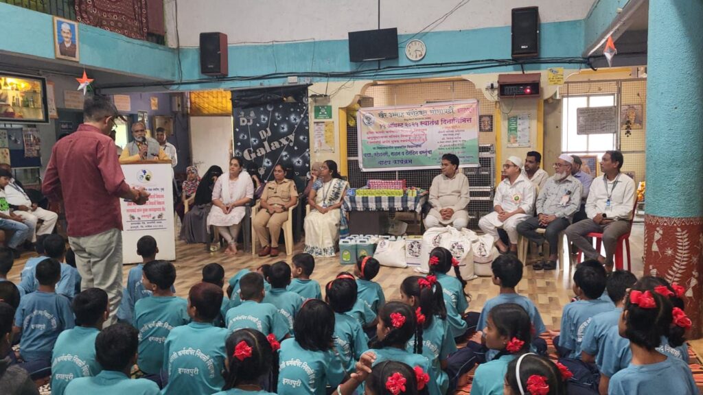 इगतपुरीनामा न्यूज – गरजूंसाठी नेहमीच मदतीचा हात पुढे करणाऱ्या खैर उम्माह चॅरिटेबल सोसायटी, इगतपुरी यांनी स्वातंत्र्यदिनाचे औचित्य साधत एक स्तुत्य उपक्रम राबविला. इगतपुरी येथील इंदिरा गांधी कर्णबधिर विद्यालयातील १२० विद्यार्थ्यांना शालेय साहित्य, दैनंदिन जीवनात उपयोगी वस्तू आणि अन्नधान्याचे वाटप करण्यात आले. या उपक्रमात विद्यार्थ्यांना वह्या, पेन, पेन्सिल, यांसह साबण, तेल, टूथपेस्ट, फिनाईल अशा वैयक्तिक स्वच्छतेच्या वस्तूंचा समावेश असलेली किट्स वितरित करण्यात आली. विद्यार्थ्यांच्या कुटुंबांना दिलासा देण्यासाठी तांदूळ, तेल, गहू अशा आवश्यक अन्नधान्याचे पॅकेट्सही देण्यात आले. कार्यक्रमात प्रमुख पाहुणे म्हणून इगतपुरी पोलीस ठाण्याच्या पोलीस निरीक्षक सारिका अहिरराव, पोलीस उपनिरीक्षक कांचन भोजने, देवयानी गायकवाड, अभिजीत पोटिंदे, गटशिक्षणाधिकारी निलेश पाटील, डॉ. हारून रशीद कादरी, नाशिक, ॲड. शबाना मेमन, डॉ. अशपाक शेख, सोसायटीचे अध्यक्ष इम्रान खान, सेक्रेटरी इमरान शेख, तौसिफ सय्यद, अविनाश कासार, जावेद सिद्दिकी, खजिनदार मुजफ्फर सय्यद, नदीम खान, अय्याज खान, सामाजिक कार्यकर्ते इफ्तेकार शेख, पत्रकार सुमित बोधक, शैलेश पुरोहित, पदाधिकारी, स्वयंसेवक व नागरिक उपस्थित होते. मुख्याध्यापक हेमलता जाधव यांनी उपक्रमाचे स्वागत करून खैर उम्माह चॅरिटेबल सोसायटीचे आभार मानले. या उपक्रमाच्या निमित्ताने गरजू व विशेष विद्यार्थ्यांसाठी सामाजिक बांधिलकी जपण्याचा आदर्श खैर उम्माह चॅरिटेबल सोसायटीने पुन्हा एकदा उभा केला आहे. समाजातील अशा संस्था गरजूंना आधार देत असताना समाजात एक सकारात्मक ऊर्जा निर्माण होत असून, इतरांनीही अशा उपक्रमातून प्रेरणा घ्यावी, असे मत यावेळी एनबीटी लॉ कॉलेजचे मुख्याध्यापक हारून रशीद कादरी यांनी व्यक्त केले.