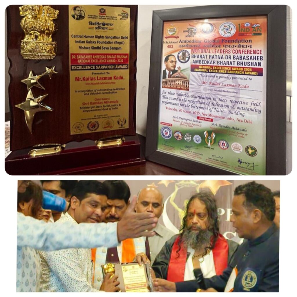 इगतपुरीनामा न्यूज – इगतपुरी तालुक्यातील शेणवड बुद्रुकचे सरपंच कैलास लक्ष्मण कडू यांना भारतरत्न डॉ. बाबासाहेब आंबेडकर भारत भुषण व क्रांती ज्योती सावित्रीबाई फुले राष्ट्रीय उत्कृष्टता पुरस्कार २०२५ प्रदान करण्यात आला. हा पुरस्कार सरपंच म्हणून कैलास कडू यांनी केलेल्या ग्रामविकासासाठी सर्वोत्तम योगदान, गावाचा शाश्वत विकास आणि समाजाच्या विधायक कार्यामध्ये उत्कृष्ट कामगिरीसाठी देशातील एक मानाचा आणि प्रतिष्ठेचा पुरस्कार आहे. केंद्रीय सामाजिक न्याय व अधिकारिता राज्यमंत्री ना. रामदास आठवले, राज्यसभा खासदार डॉ. अनिल बोनडे, मुख्य आयोजक डॉ. मनीष गवई यांच्या हस्ते नवी दिल्ली येथील नवीन महाराष्ट्र सदनात ह्या पुरस्काराचे वितरण करण्यात आले. आंबेडकर ग्लोबल फाउंडेशन, सेंट्रल ह्यूमन राईट्स संघटन दिल्ली, इंडियन गॅलक्सी फाउंडेशन, विश्व सिंधी सेवा संघम यांच्यातर्फे हा मानाचा पुरस्कार सोहळा मोठ्या उत्साहात संपन्न झाला. सरपंच कैलास कडू हे शेणवड बुद्रुक ग्रामपंचायत अंतर्गत खडकवाडी ह्या छोट्याशा गावातील रहिवासी आहेत. ते गेल्या अनेक वर्षांपासून गावाचे सरपंचपद भूषवत आहेत. त्यांच्या कार्यकाळात विविध विकासकामे झाली असून अनेक कामे प्रगतीपथावर आहेत. आज मिळालेला राष्ट्रीय पुरस्कार माझ्या ग्रामपंचायत अंतर्गत सर्व गावकऱ्यांना समर्पित करतो. यापुढेही गावासाठी सातत्याने सेवा करण्याची ताकद ह्या पुरस्काराने दिली असल्याचे मनोगत त्यांनी व्यक्त केले.