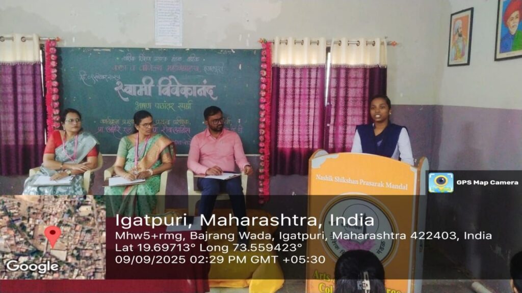 इगतपुरीनामा न्यूज – नाशिक शिक्षण प्रसारक मंडळाच्या इगतपुरी येथील कला व वाणिज्य महाविद्यालयात स्वामी विवेकानंदांच्या शिकागो येथील दिलेल्या भाषणाची स्पर्धा घेण्यात आली. यात मोठ्या संख्येने विद्यार्थ्यांनी सहभाग नोंदवला. स्वामी विवेकानंद यांनी ११ सप्टेंबर १८९३ रोजी शिकागो येथील जागतिक धर्मपरिषदेत दिलेल्या ऐतिहासिक भाषणाने आपल्या देशाची वेगळी ओळख जगाला झाली. त्या भाषणाची पाठांतर स्पर्धा घेऊन त्यातले अमूल्य विचार विद्यार्थ्यांमध्ये रुजवावे हा आमच्या संस्थेचा मानस असून त्यासाठी स्पर्धा घेण्यात आली. या स्पर्धेप्रसंगी अनिस शेख हे परीक्षक म्हणून उपस्थित होते. त्यांनी विद्यार्थ्यांचे भरभरून कौतुक केले. विजेत्या विद्यार्थ्यांना बक्षीस देऊन गौरवण्यात आले. ह्या कार्यक्रमाचे नियोजन व मार्गदर्शन प्रा. एल. एस. अहिरे यांनी केले. प्रभारी प्राचार्या प्रतिभा हिरे यांनी आपल्या भाषणात स्वामी विवेकानंदाच्या कर्मयोग, ज्ञानयोग, भक्तियोग व राजयोग याविषयी माहिती दिली. कार्यक्रमाचे सूत्रसंचालन प्रा. जे. एल. सोनवणे यांनी तर आभार प्रा. एम. डी. भालेराव यांनी केले.