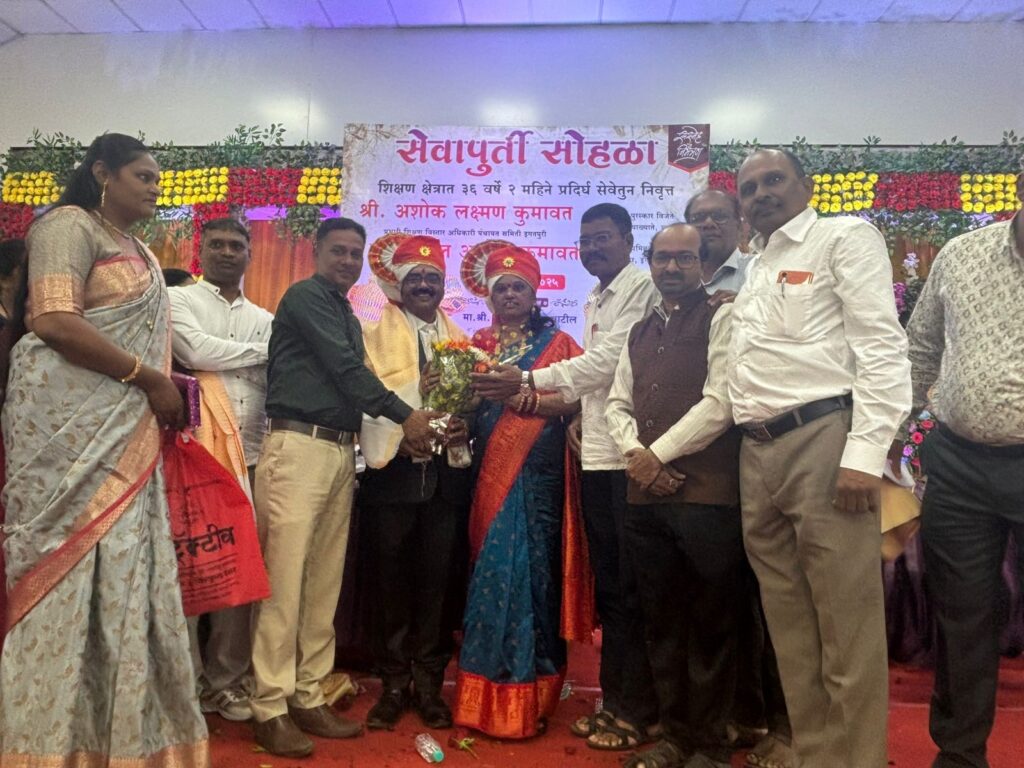 राष्ट्रपती पुरस्कार विजेते शिक्षक, लेखक, कवी, मोटीव्हशनल स्पीकर, सूत्रसंचालक अशोक कुमावत यांचा सेवापूर्ती सोहळा प्रचंड उपस्थितीत मोठ्या दिमाखात पार पडला. त्यांच्या सेवापूर्ती कार्यक्रमाला उपस्थित खासदार, आमदार, नगरसेवक, शिक्षक जनसमुदाय, शिक्षक नेते, समाजातील राज्यभरातील कुमावत बांधव, साहित्य क्षेत्रातील मान्यवर, राजकीय नेते ही सर्व आयुष्यभर केलेल्या कामाची पावतीच म्हणावी लागेल. सेवानिवृत्तीचा दिमाखदार सोहळा क्वचितच शिक्षकांच्या नशिबात असतो. यावरूनच अशोक कुमावत हे शिक्षण क्षेत्रातील कोहिनूर असल्याचे सिद्ध होते. ग्रामोन्नतीचा पाया शिक्षण । उद्याचें राष्ट्र आजचें संतान । यासाठी आदर्श पाहिजेत गुरुजन । राष्ट्रनिर्माते याप्रमाणे कार्य करणारे अशोक कुमावत शिक्षण क्षेत्रातील कोहिनूर आहेत. हे व्यक्तिमत्व राष्ट्रपती पुरस्कार विजेते असून सेवापुर्ती सोहळ्यानिमित्ताने त्यांच्या ३६ वर्षाचा अविस्मरणीय विहंगम लेखाजोखा मांडणे यानिमित्ताने क्रमप्राप्त ठरते. शिक्षणांत अशीच करावी व्यवस्था । न होईल परस्परांची अनास्था । या दृष्टीने शिकवोनि समस्तां । वळण द्यावें नैतिकतेचें पुरस्कार करणाऱ्या अशोक कुमावत यांचे दैदिप्यमान कार्य सर्वांसाठी दिपस्तंभ ठरेल यात शंका नसावी.