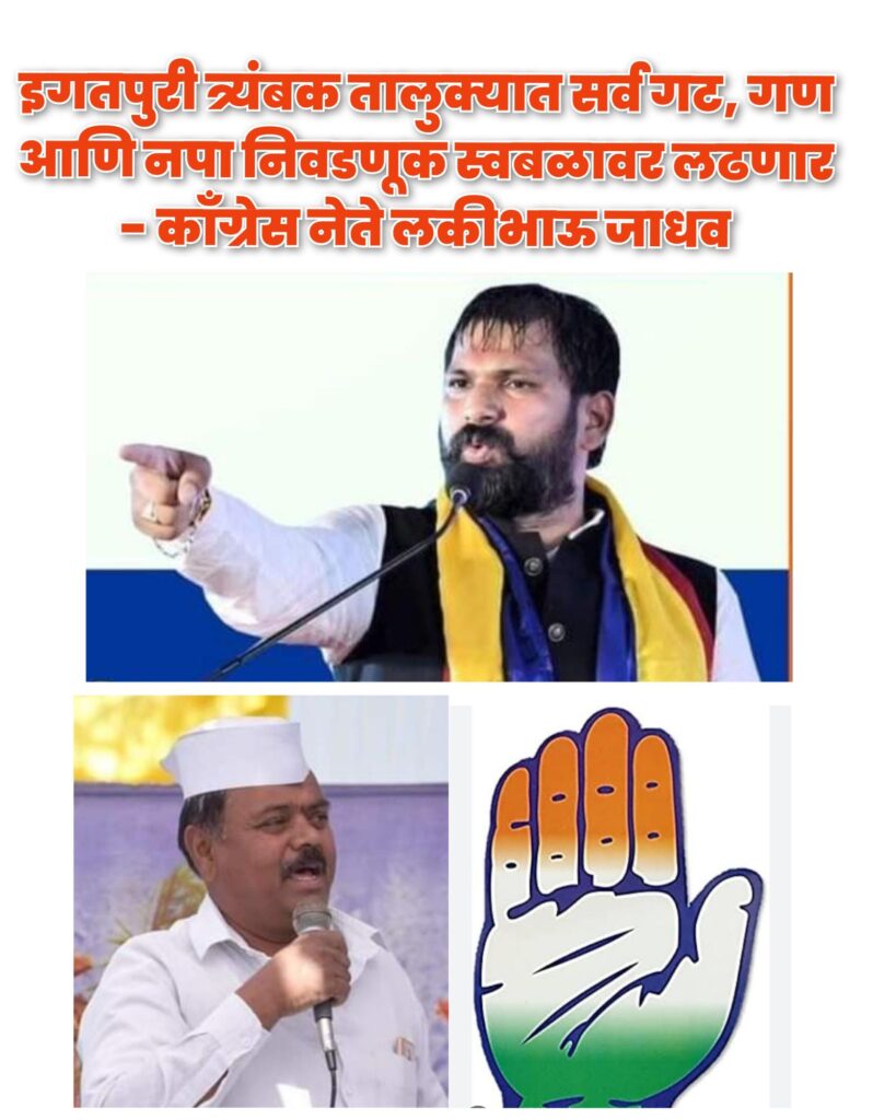 भास्कर सोनवणे : इगतपुरीनामा न्यूज – इगतपुरी त्र्यंबकेश्वर तालुक्यातील जिल्हा परिषद पंचायत समिती निवडणुकीत सर्व गट आणि गणात इंदिरा काँग्रेस स्वतंत्रपणे निवडणूक लढवणार आहे. इगतपुरी त्र्यंबक नगरपरिषद निवडणुकीतही स्वतंत्र लढा देण्याचे ठरवण्यात आले आहे. गत विधानसभा निवडणुकीत महाविकास आघाडीतील शिवसेना ( उबाठा ), राष्ट्रवादी (शप ) या प्रमुख पक्षांनी अन्य उमेदवारांना सहकार्य करून आघाडीधर्म पाळला नाही. त्यामुळे त्यांनाही त्यांची जागा दाखवून देण्यासाठी काँग्रेस पक्ष समर्थ आणि सक्षम उमेदवार देऊन निवडणूक लढवणार आहे. विधानसभा निवडणुकीवेळी एकाकी पाडूनही काँग्रेसने २ माजी आमदारांना तिसऱ्या आणि चौथ्या क्रमांकावर नेवून ठेवले. इगतपुरी त्र्यंबक तालुक्यातील निवडणुकीसाठी योग्य उमेदवार उमेदवारी मिळण्याच्या संपर्कात असून योग्यवेळी नावे घोषित केली जातील. पैशाच्या जोरावर उमेदवारांवर दबाव, गुंडगिरी आणि पळवापळवी होऊ नये म्हणून काँग्रेस पक्ष काळजी घेत आहे. या निवडणुकीत आघाडीधर्म न पाळणाऱ्यांचा वचपा काढून पळता भुई थोडी करू असा आक्रमक पवित्रा काँग्रेस नेते लकीभाऊ जाधव यांनी घेतला आहे. विधानसभा निवडणुकीवेळी आपली सर्व शक्ती पणाला लावून अत्यंत बिकट काळात पक्षाचा उमेदवार दुसऱ्या क्रमांकावर आणणारे काँग्रेसचे इगतपुरी तालुकाध्यक्ष रामदास पाटील धांडे यांनीही लकीभाऊ जाधव यांच्या भूमिकेचे समर्थन केले आहे. परिणामी इगतपुरी त्र्यंबक तालुक्यातील जि. प. पं. स. आणि नप निवडणुकीत चांगलाच रंग येणार आहे.