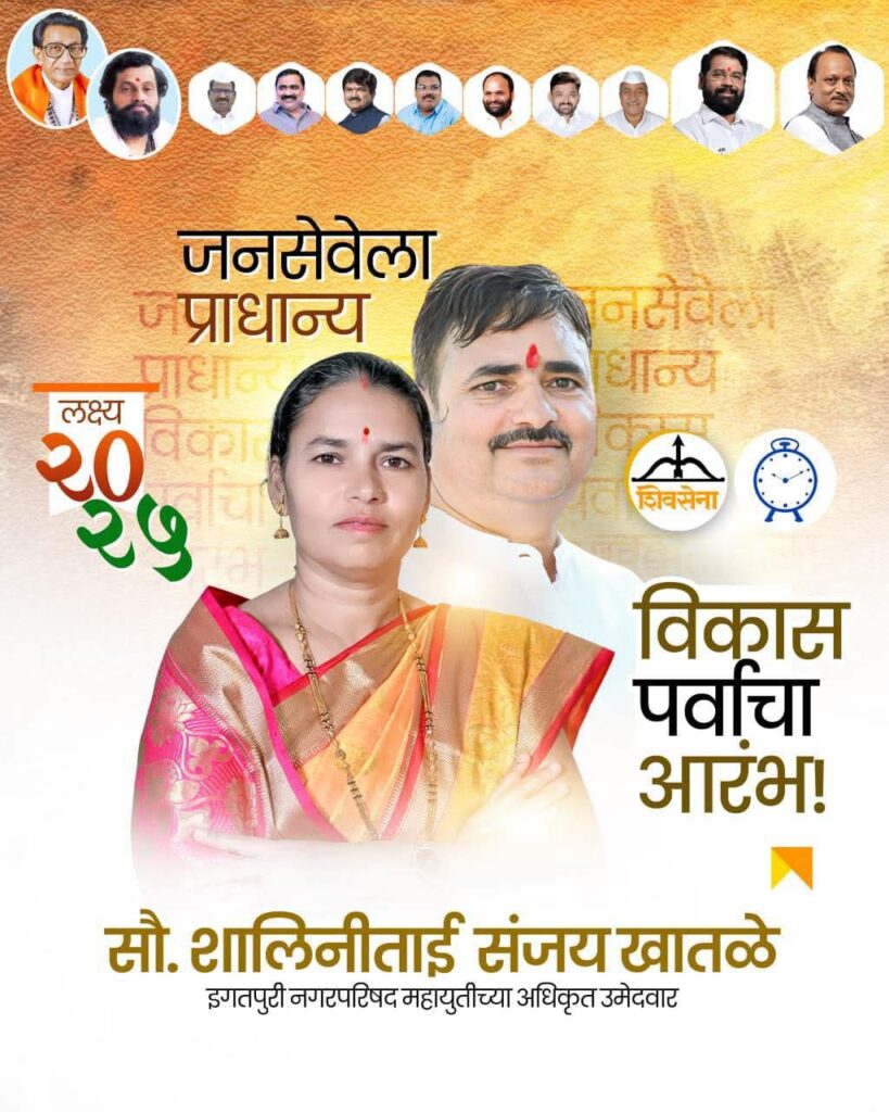 भास्कर सोनवणे : इगतपुरीनामा न्यूज – इगतपुरी शहराला २४ तास पाणीपुरवठा करण्याचा दृढ संकल्प, स्वच्छतेचा आदर्श निर्माण करणारे शहर, तळागाळातील घटकांना केंद्रबिंदू मानून शासकीय योजना त्यांच्यापर्यंत पोहचविण्याचे काम आणि इगतपुरीकर नागरिकांना आनंद वाटेल अशी सर्वोच्च कामगिरी करण्यासाठी नगराध्यक्षपदाची उमेदवारी करीत आहे. प्रत्येक प्रभागात समाजाच्या चांगुलपणासाठी झटणारे, गोरगरिबांचे कैवारी म्हणून काम करणारे आणि नीतिमत्ता संपन्न, चारित्र्यवान, शिलवान उमेदवार उभे केले आहेत. इगतपुरीचे मतदार बंधू भगिनी सुजाण आहेत. त्यामुळे आमचा विजय ही काळ्या दगडावरची न पुसणारी रेखा आहे असा ठाम विश्वास शिवसेना धनुष्यबाण, राष्ट्रवादी काँग्रेस घड्याळ गटाच्या नगराध्यक्ष पदाच्या अधिकृत उमेदवार सौ. शालिनीताई खातळे यांनी व्यक्त केला. नाशिक, मुंबई आणि पुणे असा सुवर्णत्रिकोण साधणारी इगतपुरी ही खऱ्या अर्थाने इंद्रपुरी म्हणून नावलौकिकाला पात्र ठरवण्यासाठी आम्ही ही निवडणूक हाती घेतली आहे. यापूर्वी ह्या शहराला अविकसित ठेवणाऱ्या प्रवृत्तीचा बिमोड निवडणुकीच्या मतदानात उमटणार आहे. यासाठी सर्व इगतपुरीकरांनी शिवसेना धनुष्यबाण, राष्ट्रवादी काँग्रेस घड्याळ यांचे सर्व अधिकृत उमेदवार निवडून द्यावेत असे आवाहन यावेळी सामाजिक कार्यकर्ते संजय खातळे यांनी केले. इगतपुरी नगरपरिषद निवडणुकीत आम्ही संपूर्ण ताकदीने उतरलो असून इगतपुरी शहराच्या पुढील ५० वर्षाच्या भविष्यासाठी मतदारांनी सुद्धा आमच्या हातात सत्तेच्या चाव्या देण्याचा निर्णय घेतलेला आहे. त्यामुळे आम्ही सर्वजण इगतपुरीला सुंदर आणि विकसित इंद्रपुरी करण्यास कटीबद्ध आहोत असेही सौ. शालिनी संजय खातळे यांनी सांगितले.
