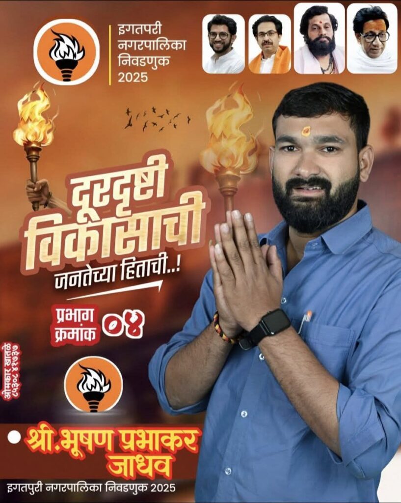 आजारी वृद्धांच्या उपचारांसाठी मदत, विद्यार्थ्यांच्या शिक्षणासाठी आर्थिक सहकार्य, तरुणांना रोजगार मार्गदर्शन, महिलांसाठी स्वावलंबन उपक्रम, शेतकऱ्यांच्या अडचणींचे निराकरण अशा अनेक क्षेत्रांत त्याने स्वतःहून पुढाकार घेत लोकांना साथ दिली आहे. त्याचे कार्य खूपच बोलके आहे, म्हणूनच लोक त्याला मनापासून प्रेम करतात. प्रभाग ४ मधील ह्या ‘उगवत्या सूर्या’ला भरघोस मतांनी विजयी करा असे आवाहन चक्क नागरिकच करायला लागलेत. समाजकारणाचा पाया, प्रामाणिकतेची शिदोरी, तरुणाईची उर्मी आणि जनतेचा आशीर्वाद घेऊन भूषण जाधव आज विकासाच्या नवीन युगाकडे अनेकांना ठिकाणावर आणण्यासाठी विजयी वाटचाल करत आहे. प्रभाग ४ चा विकास हा भूषण जाधवचा संकल्प असून फक्त निवडणुकीचा मुद्दा नाही. भूषण जाधवला तुमचे मत म्हणजे इगतपुरीच्या उज्ज्वल भविष्य, प्रामाणिक नेतृत्वाची निवड, समाजकारणाला दिलेला मान अन विकासाच्या नवीन पहाटेची सुरुवात आहे. प्रभाग ४ मधून विजयी मतदान फक्त भूषण जाधवलाच होईल. म्हणून भूषण जाधव यांचा विजय पाहण्यासाठी नागरिक उत्सुक आहेत.