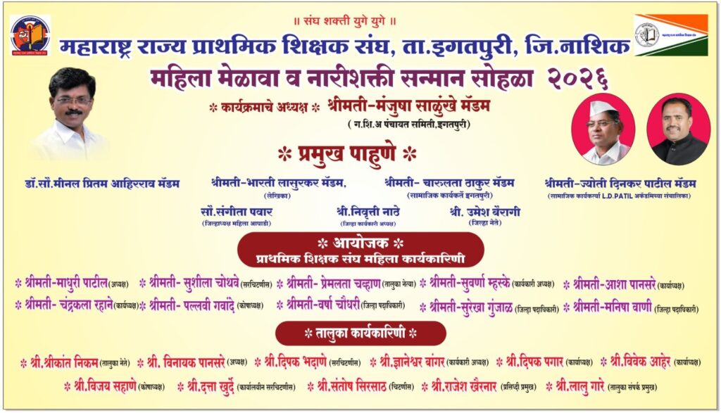 इगतपुरीनामा न्यूज – जागतिक महिला दिनाचे औचित्य साधून दरवर्षीप्रमाणे यावर्षीही महाराष्ट्र राज्य प्राथमिक शिक्षक संघातर्फे इगतपुरी तालुक्यातील आपल्या कामाचा वेगळा ठसा उमटून नावलौकिक करणाऱ्या महिलांना “नारी शक्ती सन्मान” पुरस्कार देण्यात येणार आहे. इगतपुरी तालुक्यातील आदर्श शिक्षिका व विविध सामाजिक कार्यकर्त्या यांना हा मानाचा पुरस्कार देऊन सन्मानित केले जाईल. लक्ष्मी लॉन्स गोंदे दुमाला येथे मंगळवारी १० मार्चला दुपारी १२ वाजता महिला मेळावा व पुरस्कार वितरण सोहळा संपन्न होणार आहे. कार्यक्रमाच्या अध्यक्ष म्हणून इगतपुरीच्या गटशिक्षणाधिकारी मंजुषा साळुंखे, प्रमुख पाहुणे म्हणून डॉ. मीनल प्रितम आहिरराव, लेखिका भारती लासुरकर, सामाजिक कार्यकर्त्या चारुलता ठाकूर, ज्योती दिनकर पाटील, महिला आघाडी जिल्हाध्यक्ष संगीता पवार, जिल्हा कार्यकारी अध्यक्ष निवृत्ती नाठे, जिल्हा नेते उमेश बैरागी उपस्थित राहणार आहेत. या कार्यक्रमात भाग्यवान महिलांना लकी ड्रॉ सोडत पध्दतीने २ सेमी पैठणी, २ पर्स, २ मनगटी घड्याळ दिले जाईल. इगतपुरी तालुक्यातील सर्व महिला भगिनींनी कार्यक्रमाला उपस्थित रहावे असे आवाहन आयोजकांनी केले आहे.